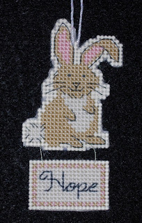This sweet little rabbit pattern came from 120 Celebration Cross Stitch Cards by Gillian Souter. The pattern for the writing comes from Better Homes and Gardens 2001 Cross Stitch Designs. The ornament is stitched on 14-count Darice cream plastic canvas.