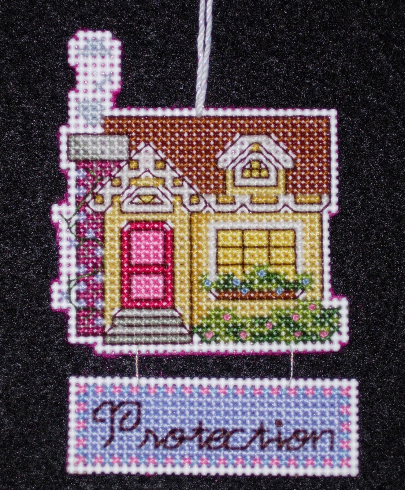The house pattern comes from Better Homes and Gardens 2001 Cross Stitch Designs. So does the pattern for the writing. The ornament is stitched on 14-count Darice white plastic canvas.