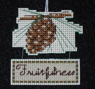 Like everyone else, I had the hardest time finding a pinecone. I got this one on ebay in a little kit that had to date from the 1980s. Everything in it smelled musty (I threw out the fabric and the thread) but I'm very happy with how the pattern turned out. The pattern for the writing comes from Better Homes and Gardens 2001 Cross Stitch Designs. The ornament is stitched on 14-count Darice cream plastic canvas.