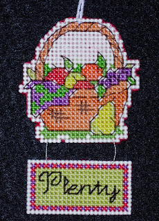 This little fruit basket came from 120 Celebration Cross Stitch Cards by Gillian Souter. The pattern for the writing comes from Better Homes and Gardens 2001 Cross Stitch Designs. The ornament is stitched on 14-count Darice cream plastic canvas.