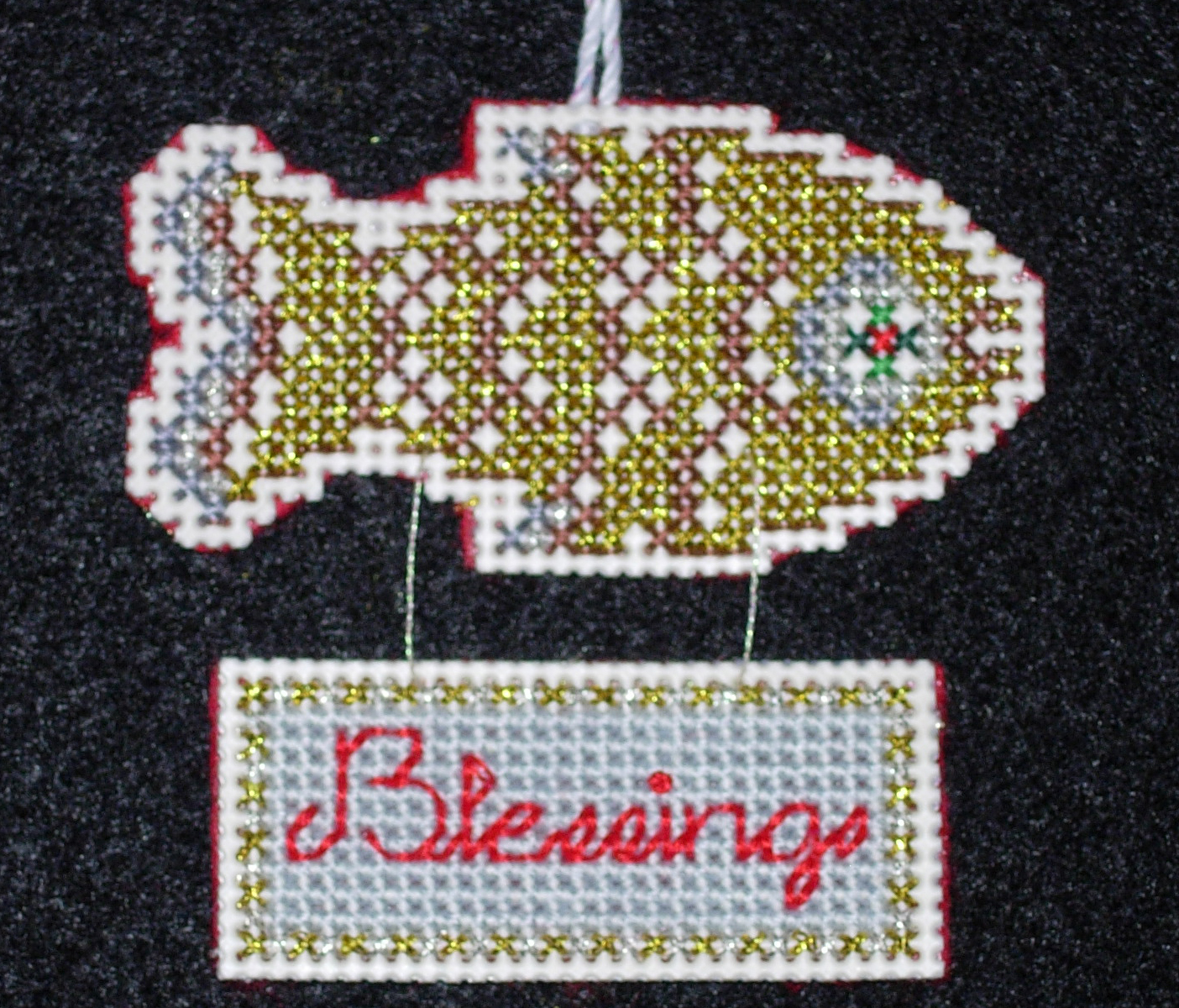 The fish came from Fifty-Five Christian Symbols, Unlimited No. 54 by Designing Women Unlimited. The patterns include the floss numbers for both regular colors and metallics. I chose to use a combination of both for this ornament. The pattern for the writing comes from Better Homes and Gardens 2001 Cross Stitch Designs. The ornament is stitched on 14-count Darice cream plastic canvas.