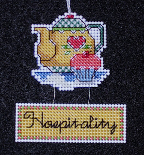 (This was already posted to the blog back in September, but I figured I may as well include it so folks could see the whole set together.) This teapot pattern, as well as the pattern for the letters, comes from Better Homes and Gardens 2001 Cross Stitch Designs. The ornament is stitched on 14-count Darice white plastic canvas.