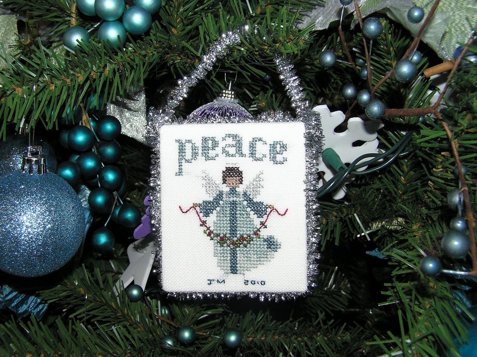 Here's my full set of Bride's Tree Ornaments. I started in January 2008. I completed January - July pretty much on time and began November. Then I had my twins, and things slowed way down. Over the next 2.5 years, I stitched August - October, and December. Sadly, November's angel isn't done and probably won't be for several years. It requires too much attention to detail for me to stitch on it much. It goes with me to doctor's and car appointments, when I know I'll be sitting (without kids!) for long stretches of time.