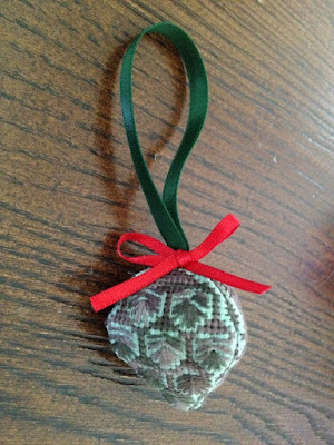 Here is my October "Pinecone" ornament. The design is from Matrioshka Biscornu. I stitched on 18ct celadon aida with Marble Thread (cosmo).